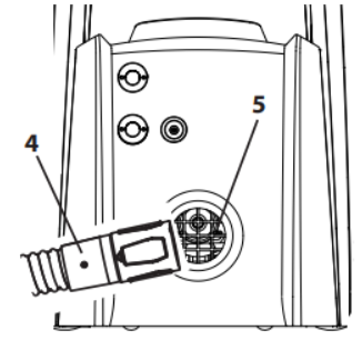 - Dickeres Ende des Luftschlauches (4) in den Luftschlauchanschluss (5) am Grundgerät einsetzen (auf Markierung achten) und durch drehen nach rechts fixieren.
