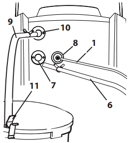 - Ansaugschlauch (9) auf Ansaugschlauchanschluss (10) stecken und mit Sicherungsklammer fixieren.