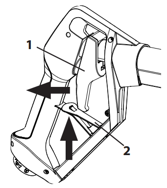 - Abzugsbügel (1) ziehen und Arretierung (2) nach oben drücken, um den Abzugsbügel zu fixieren. Wasser ca. 10 Minuten durch Gerät zirkulieren lassen, um die Pumpe und die Schläuche zu reinigen.