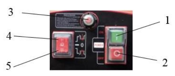 - Interrupteur de marche avant (4) : le matériau est automatiquement alimenté et haché par la lame.