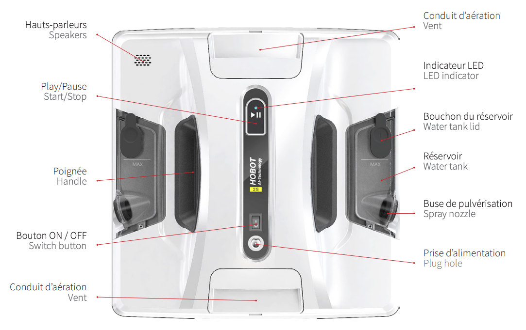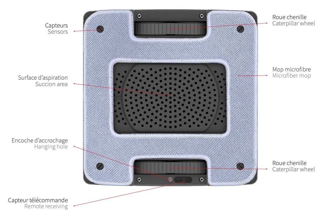 - Retournez le robot laveur de vitres de manière à voir le dessous.