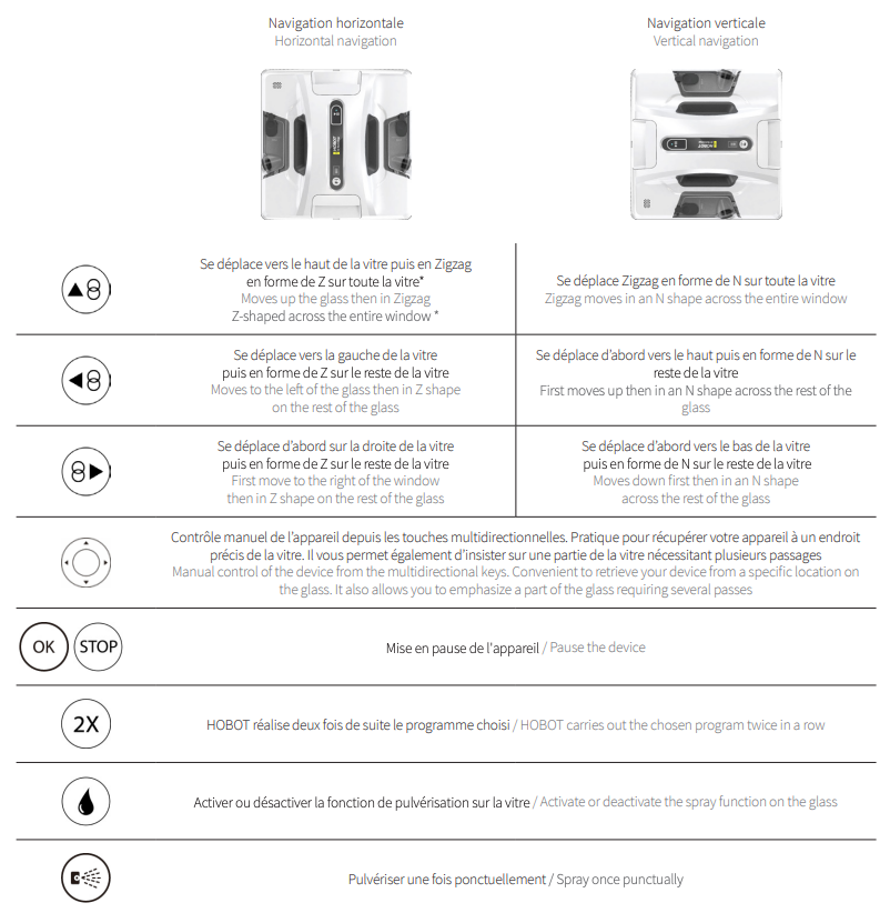 Chaque cycle de nettoyage peut être interrompu en appuyant sur les boutons Start/Pause du robot laveur de vitres et OK ou STOP de la télécommande. Pour reprendre, appuyez sur le bouton Start/Pause du robot.