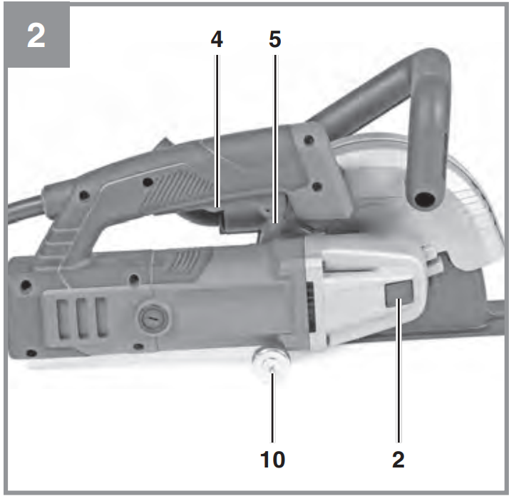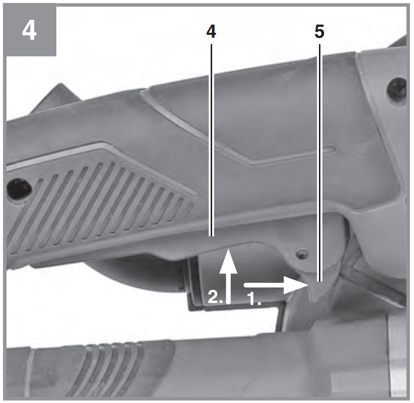 Das Gerät ist mit einem Sicherheitsschalter zur Unfallverhütung ausgestattet. Zum Einschalten den Sperrhebel (5) nach vorne schieben und dann den Ein-/ Ausschalter (4) drücken.
