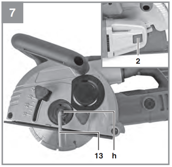 - Spindelarretierung (2) gedrückt halten und Innensechskantschraube (h) mit dem mitgelieferten Innensechskantschlüssel (13) lösen (Bild 7)
