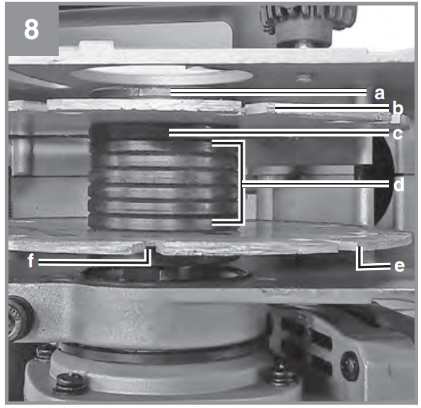 Hinweis! Jede Distanzscheibe hat eine Breite von ca. 3,5 mm. Die Nutbreite ergibt sich aus der Anzahl der Distanzscheiben (d), dem oberen Innenflansch (c) zwischen den Trennscheiben und der Dicke der beiden Trennscheiben - Obere Trennscheibe (b) aufsetzen