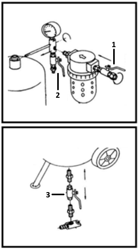 - Das Hauptventil (1) in die offene Position einstellen, um den Luftstrom vom Kompressor zum Gerät regulieren zu können.
